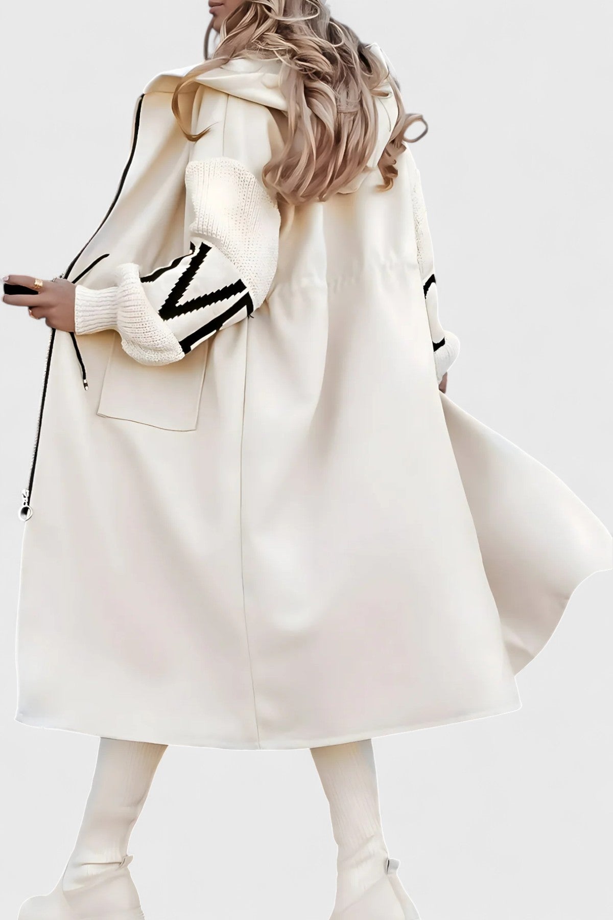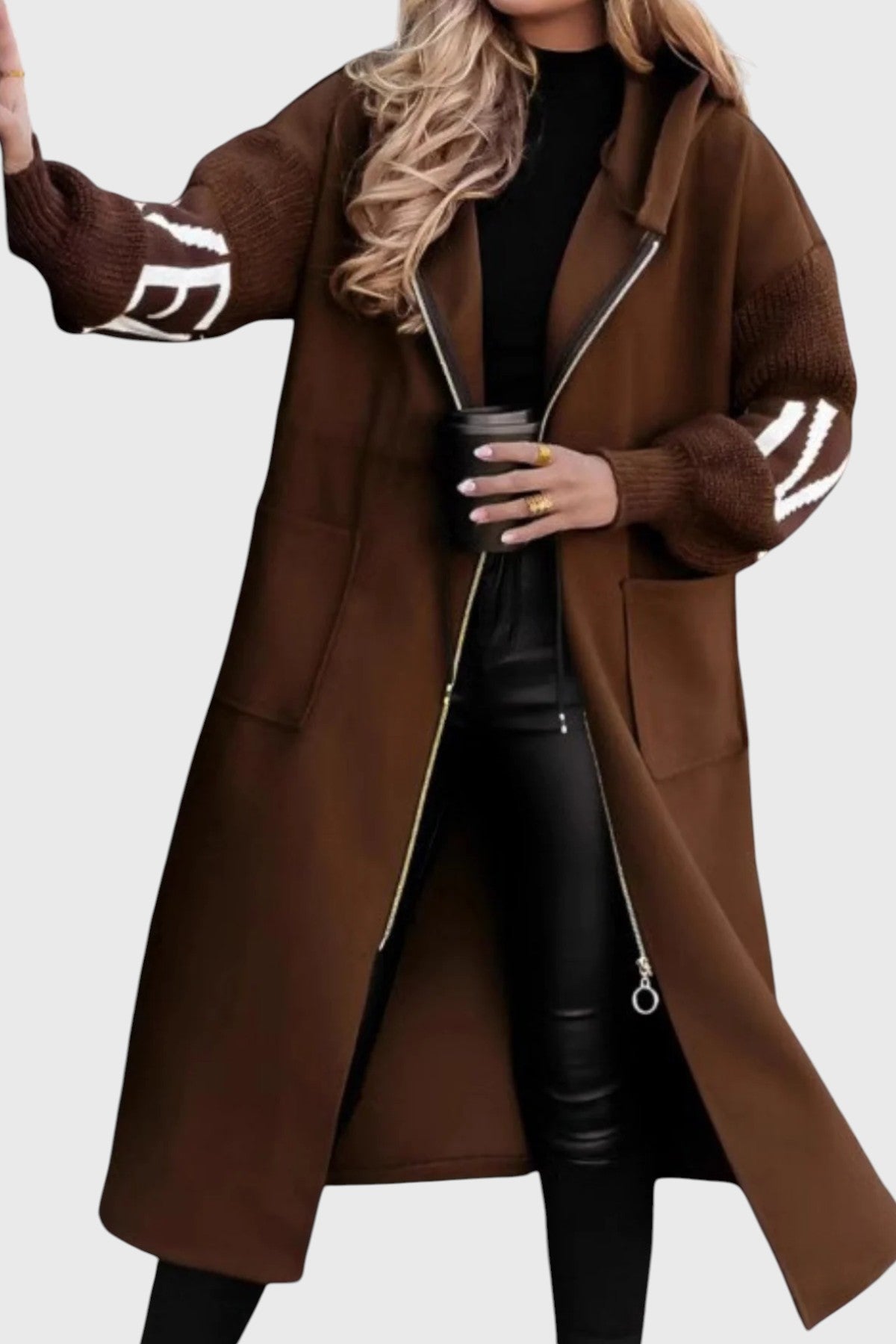 Fabricada con una mezcla de lana de alta calidad y tejido premium, garantiza un tacto suave, calidez y durabilidad para el uso diario. Sus mangas de punto con patrones geométricos añaden personalidad y un contraste elegante, convirtiéndola en una prenda imprescindible para los días más fríos.